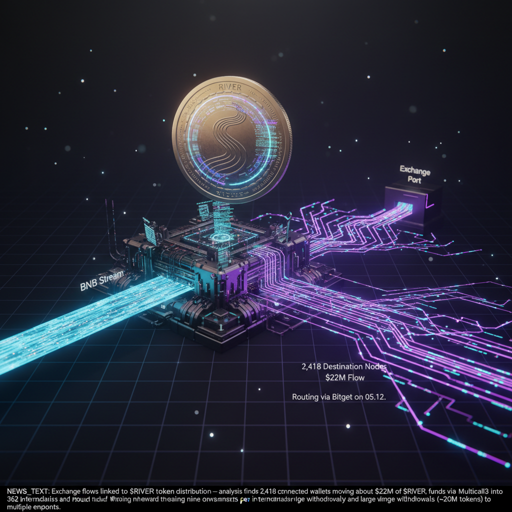 Exchange flows linked to $RIVER token distribution Analysis describes 2,418 connected wallets moving about $22M of $RIVER tokens, with core activity routed through Bitget on 05.12. Tracing the transfers The chain began with a single wallet receiving several BNB transfers from OKX, amounts that indiv…