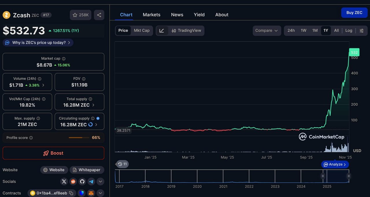 ☝🏻Цена Zcash преодолела рубеж в $520 Цена Zcash увеличилась на 20,6% за последние сутки, достигнув отметки в $533 — это самый высокий уровень с 2018 года. Рыночная капитализация токена составила $8,6 млрд, что вывело его на 17-е место среди крупнейших криптовалют.💰 Спрос на анонимные монеты тесно …