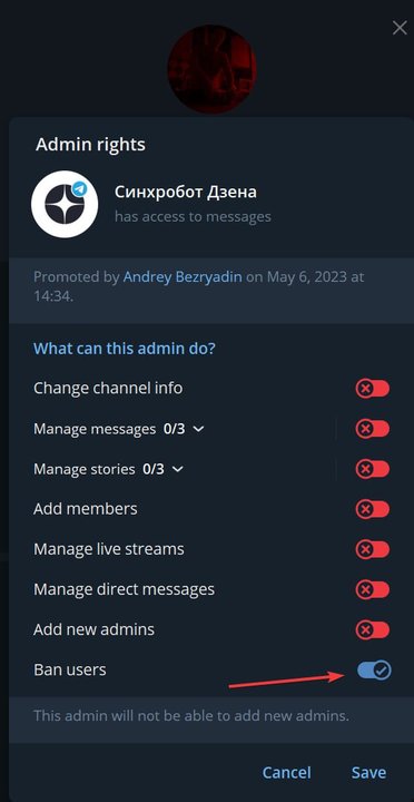 Админам. Заметил любопытное: с каким-то из последних обновлений телеги в настройках ботов появилось новое разрешение — банить пользователей. У многих ботов можно все разрешения выключить и они всё так же будут делать репосты, использоваться для передачи аналитики, и авторизации. У меня так и сделано…