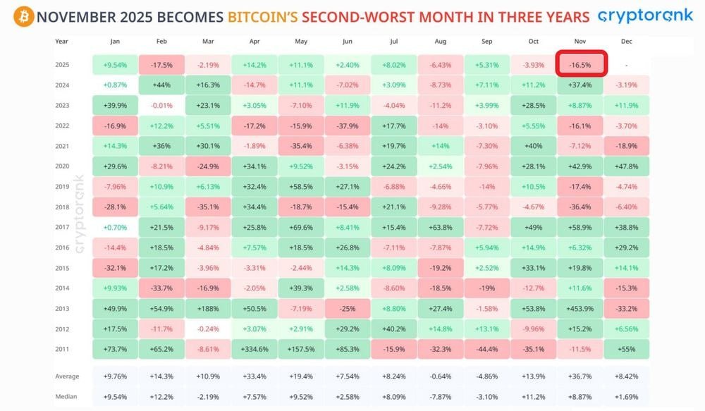Bitcoin Records Second-Worst Month in Three Years In November 2025 , Bitcoin posted its second-worst monthly performance over the past 3 years . The move marks a notable point in recent market volatility. Monthly performance The classification as the second-worst month compares November 2025 against…