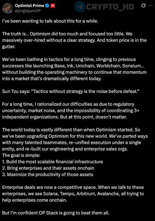 Optimism co-founder announces strategic shift toward institutions The co-founder of Optimism outlined a refocus of the project toward large institutional partnerships and operational consolidation. Background and diagnosis The team admitted it had spread resources across many initiatives, which dilu…