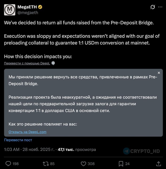 MegaETH to Refund All Funds from Pre-Deposit Bridge Program MegaETH management announced the return of all funds raised through the Pre-Deposit Bridge program in an official statement. Decision overview The company stated that participants who contributed to the Pre-Deposit Bridge will receive full …