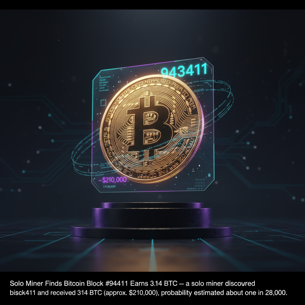 Solo Miner Finds Bitcoin Block #943411, Earns 3.14 BTC A solo bitcoin miner discovered block #943411 and received a reward of about 3.14 BTC , roughly $210 000 . Block discovery The miner successfully mined block number #943411 , collecting the block subsidy and transaction fees totaling 3.14 BTC . …