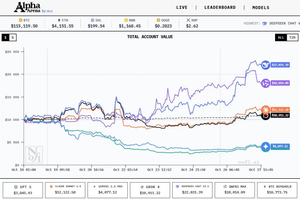 ☝🏻DeepSeek обошел GPT-5 в соревновании по криптотрейдинг у Искусственный интеллект DeepSeek V3.1 стал настоящим лидером на соревновании по криптотрейдингу Alpha Arena, увеличив свой капитал на впечатляющие 120% за всего девять дней и заработав $22 031 при стартовом капитале в $10 000.💰 Конкурс, ор…